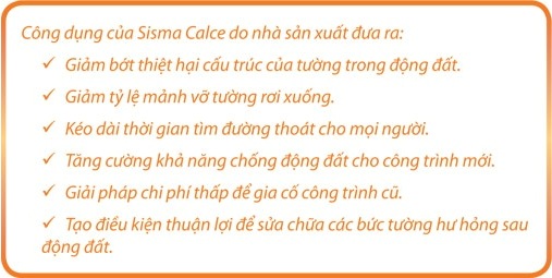 • Với động đất nhỏ, trong điều kiện thuận lợi, Sisma Calce có thể hoàn toàn ngăn chặn thiệt hại, giữ các bức tường hoàn toàn nguyên vẹn, giúp ngôi nhà trụ vững. Với những trận động đất cường độ trung bình, độ cứng của sợi thủy tinh kết dính các vết nứt nhỏ, không để lan rộng.