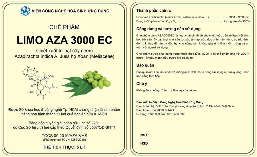 Qua dự án khởi nghiệp đổi mới sáng tạo “Sản xuất thuốc bảo vệ thực vật gốc thảo dược thân thiện với môi trường với hoạt chất azadirachtin chiết xuất từ hạt cây neem Azadirachta indica A. Juss trồng ở Việt Nam” (đã được Sở Khoa học và Công nghệ TP.HCM nghiệm thu), Viện Công nghệ Hóa sinh ứng dụng TP.HCM đã sản xuất được chế phẩm Limo AZA 3.000EC. Chế phẩm gồm các thành phần (đáp ứng các chỉ tiêu chất lượng/kỹ thuật của thuốc bảo vệ thực vật theo quy định của Hiệp hội Thuốc Sát trùng thế giới CIPAC): hoạt chất azadirachtin limonoid (AZL) 3,0%; chất làm bền (ngăn chặn tia UV tác động vào thuốc); chất tạo nhũ đậm đặc (EC); chất tăng hoạt sinh học; dung môi hydrocarbon C16-C32.
