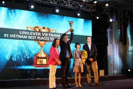 Unilever năm thứ 3 liên tiếp được bình chọn là nơi làm việc tốt nhất Việt Nam. Ảnh: LV. Buổi lễ cũng vinh danh những thương hiệu nhà tuyển dụng hấp dẫn nhất theo nhóm tiêu chí. Trong đó, Vinamilk được bình chọn là thương hiệu nhà tuyển dụng hấp dẫn nhất ở tiêu chí lương, thưởng, phúc lợi; Nestlé dẫn đầu về tiêu chí văn hóa và giá trị; Unilever hấp dẫn nhất ở tiêu chí đội ngũ lãnh đạo và cơ hội phát triển,… Đặc biệt, năm nay có thêm nhiều doanh nghiệp Việt Nam lọt vào danh sách 100 nơi làm việc tốt nhất Việt Nam, với 22 doanh nghiệp (năm 2014 là 17 doanh nghiệp).