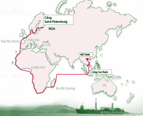 Từ đó, tàu Rolldock Sea đi vào eo biển Malacca, tới Singapore trước khi đến biển Đông rồi cập cảng Cam Ranh. Ước tính tuyến đường này dài 27.000km, xa hơn nhiều so với đi qua kênh đào Suez. Tuy nhiên con đường qua kênh đào Suez dẫn tới vịnh Aden, nơi cướp biển Somalia hoạt động mạnh. Đây cũng là vùng biển hải quân các nước tập trung đông đảo để ngăn chặn cướp biển, do đó tàu chở vũ khí đi qua khu vực này dễ bị theo dõi.