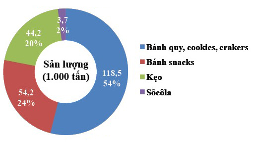 Nhóm sản phẩm bánh kẹo từ 2010 đến nay tăng đều về sản lượng lẫn giá trị, năm 2013 sản lượng đạt 221 ngàn tấn với 16,6 ngàn tỉ đồng, nhưng mức tăng trưởng giảm dần (BĐ 2). Các loại bánh quy, cookies và crackers chiếm tỉ trọng cao nhất trong nhóm sản phẩm này, kế đến là các loại bánh snacks, kẹo các loại và sôcôla (BĐ 3).