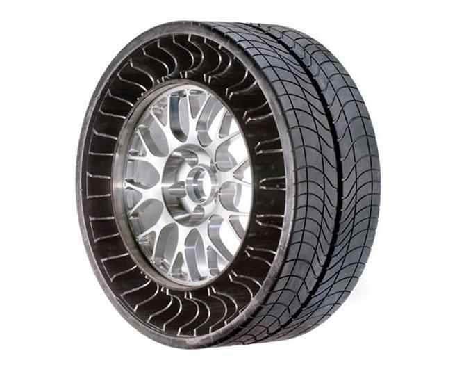 | Tại triển lãm Tokyo Motor Show 2011, những chiếc lốp không cần đến lõi săm và hơi dành cho xe dân dụng đã được công ty Bridgestone giới thiệu. Chiếc lốp được thiết kế phân lớp thành 3 phần, trong đó lớp nhựa thay thế săm được gắn từ trong vành ra tới bề mặt cao su của lốp và được đúc theo kết cấu đan xen giúp tăng khả năng chịu lực, duy trì trạng thái ổn định và linh hoạt. Người dùng sẽ không lo việc bị xì hơi khi lốp xe bị các vật cứng như đinh hay mảnh thủy tinh găm vào vì bên trong | Chiếc lốp không hơi của Michelin. |