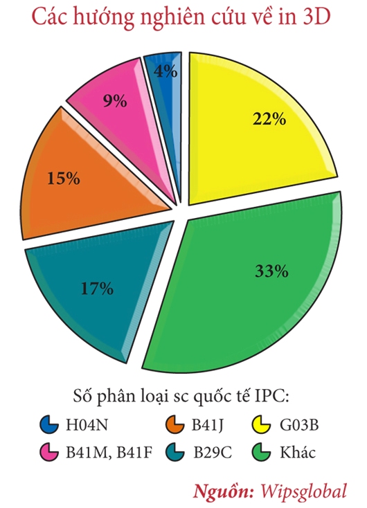 Một số hướng nghiên cứu chính trong lĩnh vực in 3D là: cải thiện thiết bị và phương pháp chụp ảnh đối tượng (G03B): 22%; ứng dụng in 3D cho sản xuất lốp ô tô (B29C): 17%; máy in, trong đó đa số là SC về hộp mực in (B41J): 15%; vật liệu in phun, đặc biệt là vật liệu dạng tấm (B41M, B41F): 9%; phương pháp và thiết bị mã hóa ảnh (H04N): 4%.
