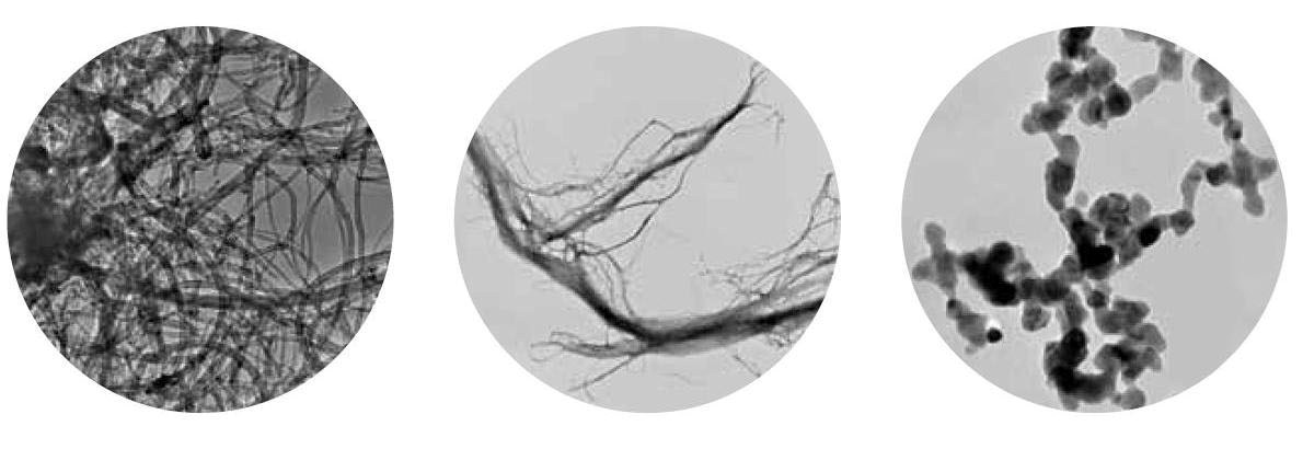 Các ống nano carbon. Ảnh: Minnamari Vippola, UTU. | Sợi nanocellulose. Ảnh: Esa Vanhala, FIOH. | Chuỗi nano oxit kẽm. Ảnh: Esa Vanhala, FIOH. |