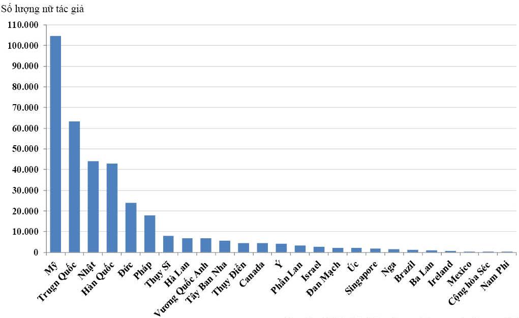 Trong giai đoạn 2011-2015, tính theo số lượng tác giả sáng chế đăng ký quốc tế PCT, phụ nữ Mỹ chiếm vị trí hàng đầu (104.565 SC), kế đến là Trung Quốc (63.365 SC), Nhật (43,957), Hàn Quốc (42,730) và Đức (23,905) (BĐ 4). Trong các quốc gia dẫn đầu đăng ký sáng chế quốc tế, Hàn Quốc và Trung Quốc có tỉ lệ tác giả sáng chế là nữ chiếm tỉ lệ cao tương đương, xấp xỉ 50%, tiếp theo là Singapore (36,6 %), Tây Ban Nha (36,3 %), Ba Lan (33,5 %),….Tại những nước phát triển như Đức, Ý, Nhật và Nam Phi tỉ lệ này không cao. Brazil và Mexico là hai nước có thu nhập trung bình có tỉ lệ nữ tác giả sáng chế tương đương với nước có thu nhập cao là Ireland và Hà Lan. Dù số lượng sáng chế nhiều nhất nhưng tỉ lệ nữ tác giả sáng chế của phụ nữ Mỹ ở mức trung bình là 29%. So sánh tỉ lệ sáng chế đăng ký quốc tế của nữ trong giai đoạn 2011 – 2015 và giai đoạn 1995-1999 cho thấy, hoạt động sáng tạo của các nhà khoa học nữ phát triển mạnh tại các nước Mexico, Tây Ban Nha, Ba Lan và Thụy Sĩ; tại Mexico tăng từ 7,8% (1995-1999) lên 25,8% (2011 – 2015), trong khi đó tại Trung Quốc, Nhật, Liên Bang Nga và Nam Phi gần như không thay đổi (BĐ 5).