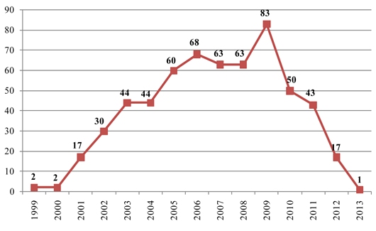 Tình hình đăng ký sáng chế về bao bì bảo quản rau, quả, thịt tươi sống từ năm 1999 - 2013