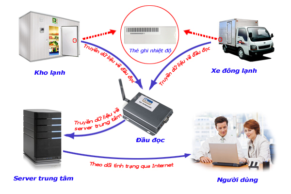 Công nghệ RFID được ứng dụng rộng rãi trong nhiều lĩnh vực, nhất là trong quản lý và tồn trữ hàng hóa. Ví dụ, dùng những thẻ RFID theo dõi nhiệt độ gắn lên hàng hóa có thể giúp nhà sản xuất theo dõi nhiệt độ trong kho lạnh. Những thẻ này sẽ truyền dữ liệu qua đầu đọc, đầu đọc liên tục truyền dữ liệu thu được từ các thẻ để truyền về máy tính trung tâm và lưu lại dữ liệu thu được. Từ đó, nhà sản xuất có thể truy cập vào internet từ bất cứ nơi nào cũng