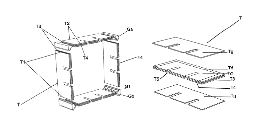 | Tóm tắt: kệ lắp ghép bao gồm: các tấm ngăn (T), cơ bản có dạng hình chữ nhật phẳng. Trong đó, mỗi tấm ngăn có khung (Td) hình chữ “U” vuông góc, có cặp cạnh bên (T1) và một cạnh bên (T2). Trên cạnh bên (T1) có rãnh (T3) chạy dọc theo chiều dài của cạnh này và tấm bổ sung (Tđ) hình chữ nhật có chứa một cạnh bên (T2) và một hoặc nhiều khe (T5) có kích thước thích hợp, được gắn bù đầy vào lòng thành phần khung (Td) để tạo thành tấm ngăn (T). Các khe (T5) vuông góc với cạnh bên (T2) và cách đều nhau. Đồng thời, khoảng cách từ mỗi cạnh (T1) của khung (Td) đến khe (T5) đầu tiên cùng phía là bằng nhau. Nhờ đó, các tấm ngăn (T) khác nhau có thể cài khe nhau để liên kết với nhau khi lắp ghép; các chi tiết góc (G) có các gờ (G1) chạy dọc theo chiều dài và có hình dạng tương ứng với rãnh (T3) trên cạnh bên (T1) của tấm ngăn (T), sao cho rãnh (T3) và gờ (G1) có thể lắp khớp với nhau tạo thành liên kết mộng. Các chi tiết góc (G) ở các vị trí khác nhau có số gờ (G1) khác nhau. |