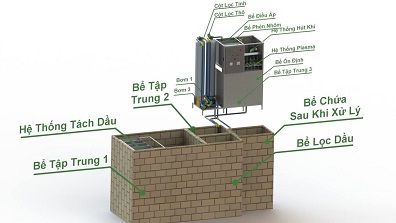Nguyên lý vận hành: tập trung nước thải vào ngăn thứ nhất của bể lắng. Tại đây, dầu mỡ được tách ra khỏi nước để chuẩn bi cho quá trình bơm vào máy. Nước thải được bơm vào máy qua cột lọc thô để loại bỏ rác và xử lý nhờ hệ thống xử lý plasma. Nước sau xử lý được chứa trong bồn và thêm vào chất kết tủa để hỗ trợ quá trình kết tủa, sau đó nước được bơm vào ngăn thứ hai của bể lắng trước khi đưa ra ngoài.