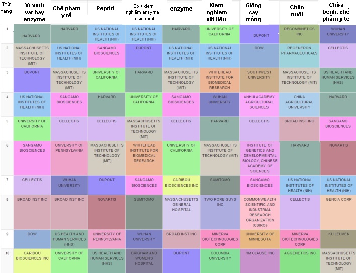 Bảng 2: Các đơn vị dẫn đầu đăng ký sáng chế liên quan đến CRISPR