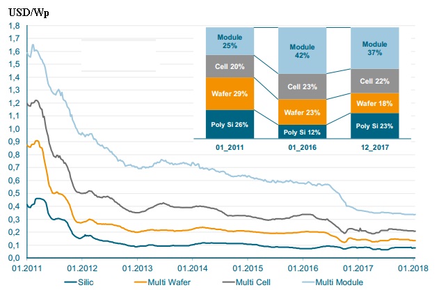 Công nghệ sản xuất PV ngày càng hoàn thiện, giúp giảm giá bán trên thị trường. Giai đoạn 2011-2012, PV c-Si có xu hướng giảm giá mạnh nhất và kéo dài cho đến nay (BĐ4).